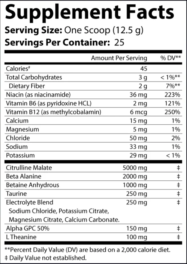 • Massive Muscle Pump – 5,000 mg of Citrulline Malate drives extreme vasodilation and skin-splitting muscle pumps that keep you going strong.